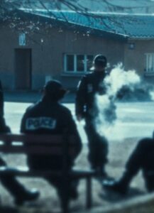 Au fil de ce premier long métrage dévoilé en compétition à Entrevues Belfort, Guillamot filme la pédagogie au quotidien. Ce peut-être apprendre à entrer dans un bureau à travers une scène qui ressemble à une étrange chorégraphie minimaliste, apprendre à se servir d’une arme, mais aussi… apprendre à ne pas adopter de comportements discriminants. Cela s’enseigne, comme on doit rappeler à un jeune homme que le contrôle d’identité avec comme critère l’apparence physique est interdit. Cette naïveté pourrait avoir un ton un peu léger, mais très vite on enseigne des coups « qui font mal et qui ne laissent pas de trace », et l’on sait que les comportements problématiques peuvent avoir des conséquences graves.